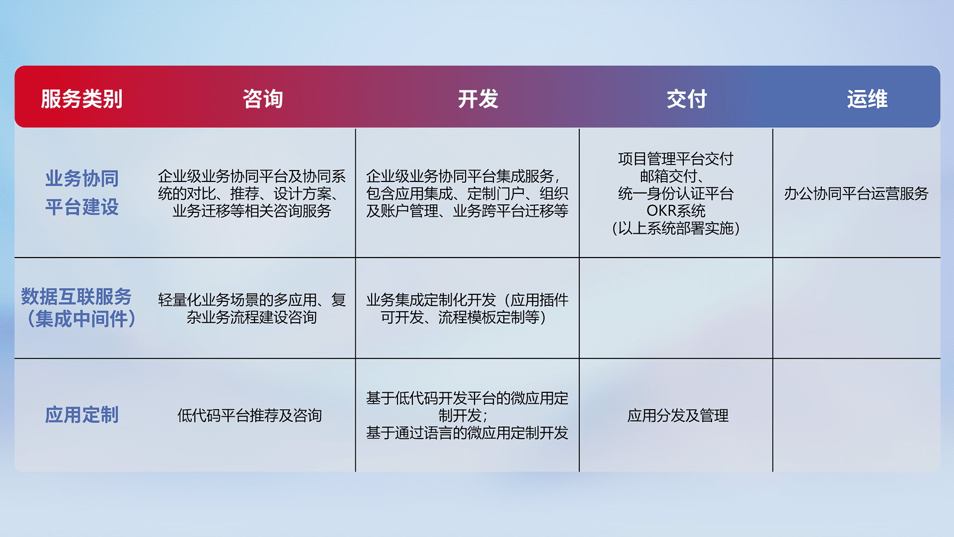针对钉钉、、、、企微、、、IDaas等平台级产品提供产品的规划、、方案、、、、交付、、、定制化开发等服务,,,,实现如统一协同办公、、智能客户服务、、、、混合会议管理、、、智能数据查询、、、、等业务场景,,,,实现数字化转型。。