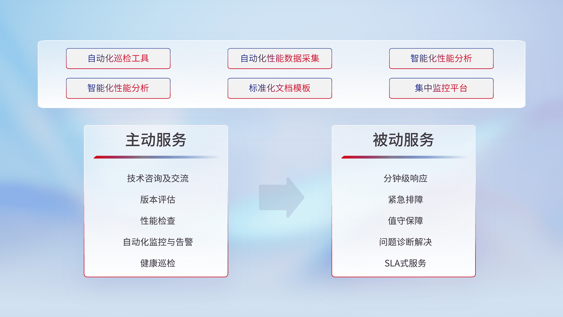 智能化工具和标准化文档,,,,保障服务质量,,,提供主动服务(包含技术咨询、、、、版本评估、、性能检查、、自动化监控与告警、、健康巡检)和被动服务包含(分钟级响应、、、紧急排障、、、值守保障、、、问题诊断解决、、SLA服务)。。。